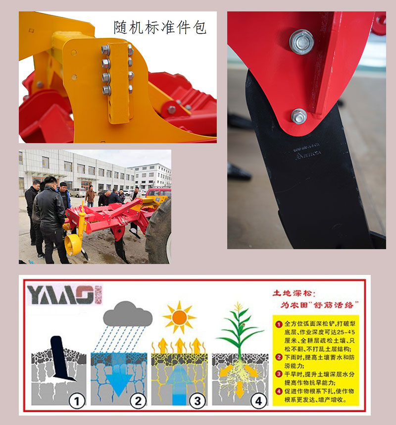 4、使用效益高; 采用原裝進(jìn)口硼鋼深松鏟,具有高強(qiáng)度和超耐磨性,比傳統(tǒng)部件使用壽命提高3-4倍,并利用保險(xiǎn)螺栓進(jìn)行過(guò)載保護(hù)。使用壽命長(zhǎng)