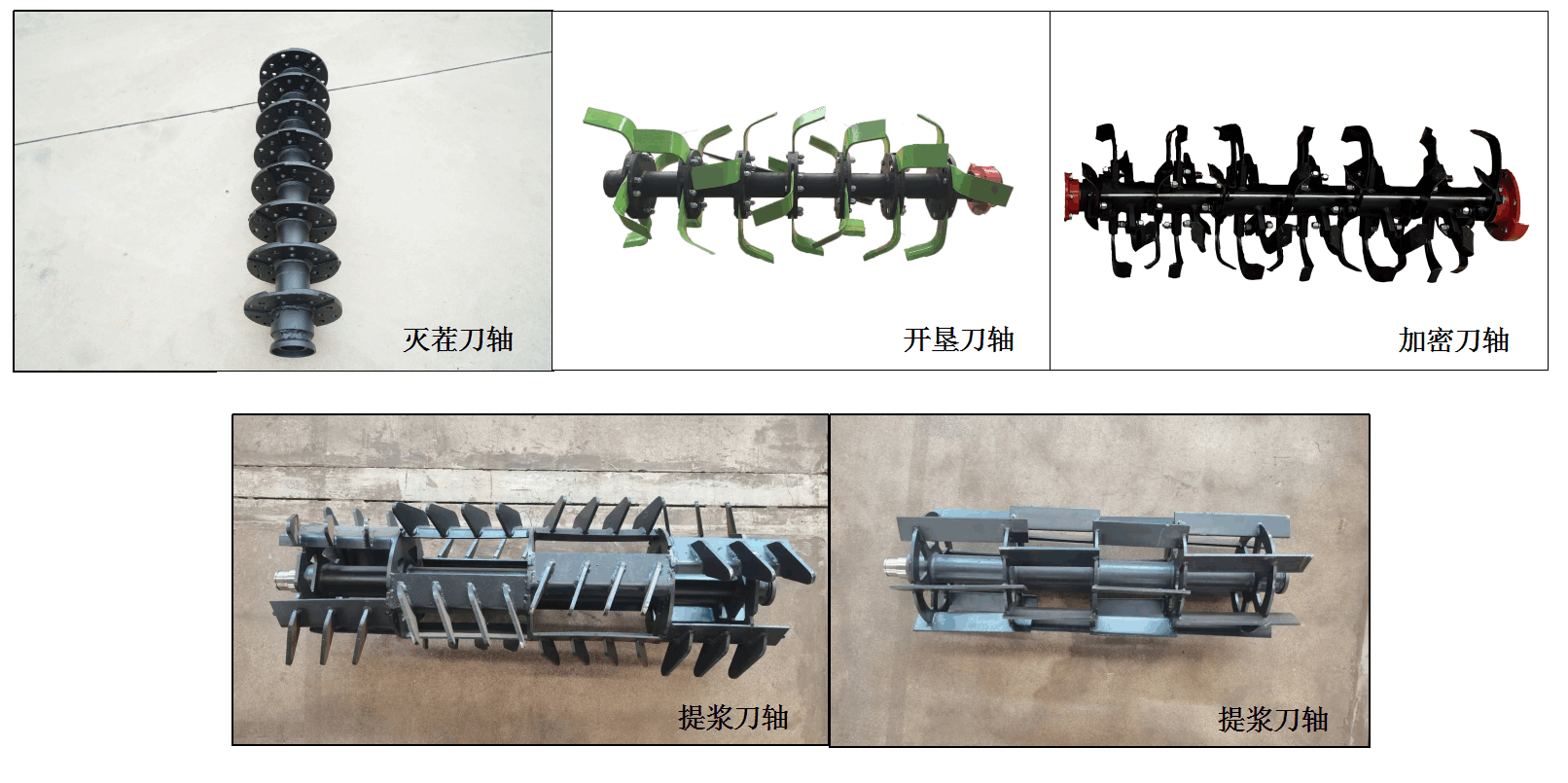可根據(jù)水旱田及農(nóng)藝需要配制:滅茬刀軸、開(kāi)墾刀軸、提漿刀軸、加密刀軸。