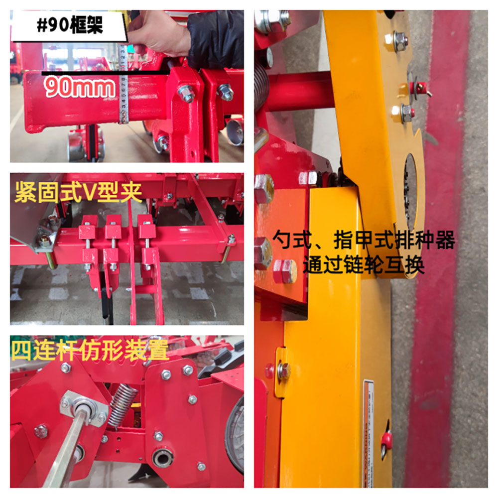 本機(jī)具是一款多功能高效專業(yè)播種玉米機(jī)械, 采用加強(qiáng)型開溝犁體,指夾和勺輪式兩選的精量排種器, 可一次性完成 開溝 、施肥 、播種 、覆土 、鎮(zhèn)壓等工序 。