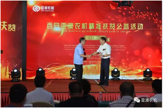 亞澳精準扶貧公益活動現(xiàn)場,中國農(nóng)機化協(xié)會會長劉憲到會致辭,并給予亞澳頒發(fā)證書。